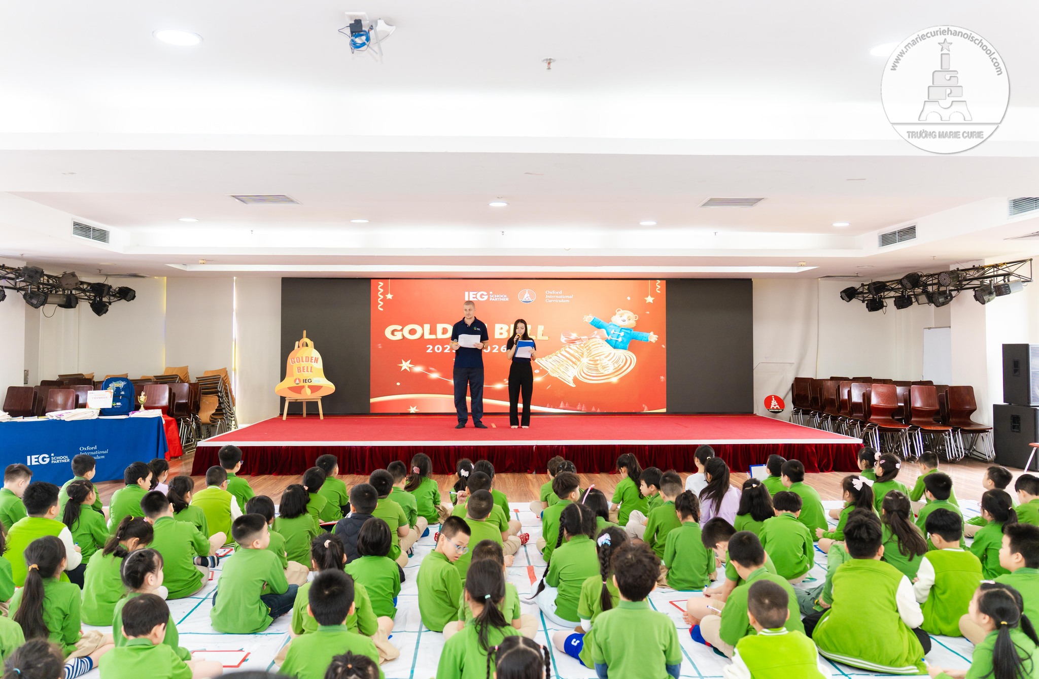 Chương trình “Golden Bell - Rung Chuông Vàng” là sự kiện thường niên do nhà trường phối hợp cùng IEG tổ chức, với mong muốn tạo ra một sân chơi trí tuệ hấp dẫn, bổ ích cho học sinh. Sau khi thi đấu tại lớp, mỗi tập thể chọn ra 15 bạn có thành tích tốt nhất để tham gia vòng Chung kết tranh tài “Rung Chuông Vàng”.