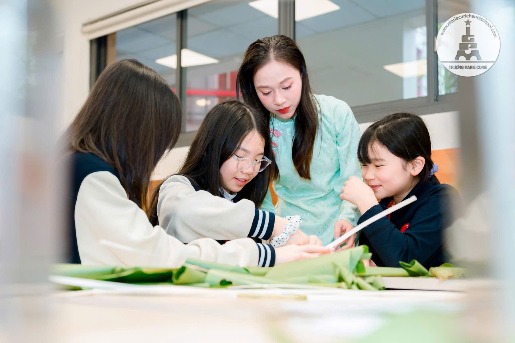 Năm nay, Thùy Lâm (7G4) đã biết cách gói bánh chưng sao cho chắc tay và vuông vắn. “Tiết học thật thú vị và ý nghĩa! Chúng tớ được hướng dẫn từng bước một và trực tiếp tập cắt lá ngay tại lớp. Tớ rất mong đến lễ hội Bánh chưng của trường”, cô bạn nói.