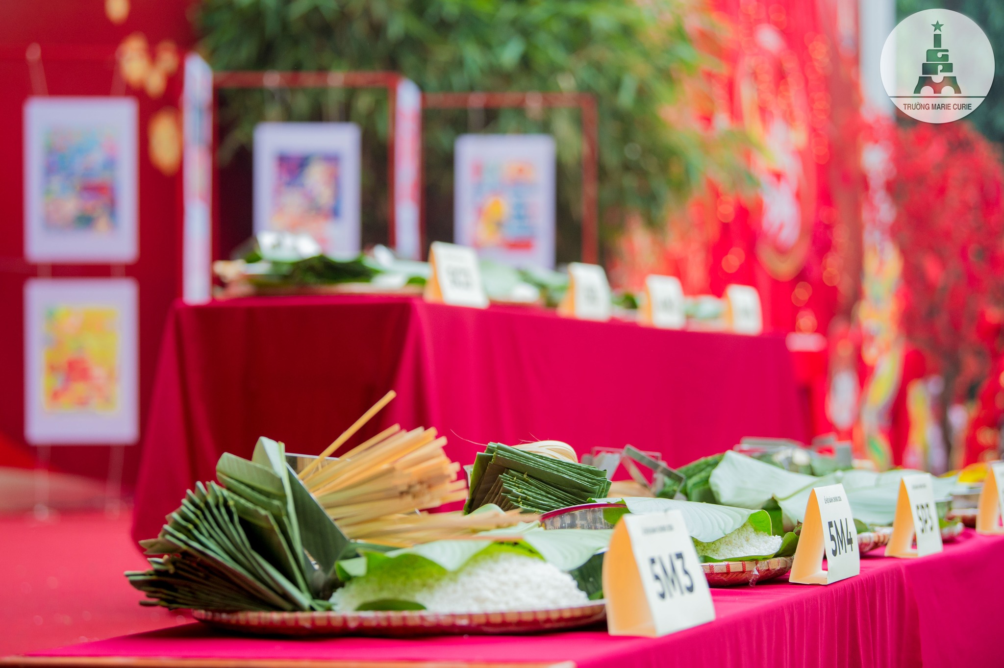 3 bạn cho biết: ““Concept” trang trí mẹt bánh chưng hằng năm của lớp hướng tới việc tái hiện một nét văn hoá truyền thống của nước ta. Năm nay, ngày thi gần ngày ông Công, ông Táo nên chúng mình mong muốn đưa tới hình ảnh cá chép để lan tỏa tình yêu với những giá trị văn hoá rất đẹp, rất riêng của người Việt. Chúng mình đã được cô Thục Hiền (GV GDĐP) dạy rất kỹ cách gói, còn thầy chủ nhiệm Thái Tuân dặn dò những lưu ý để có sản phẩm đẹp nhất như: buộc lạt phải tròn; bánh cần đầy đặn, đặc biệt ở 4 góc…”.