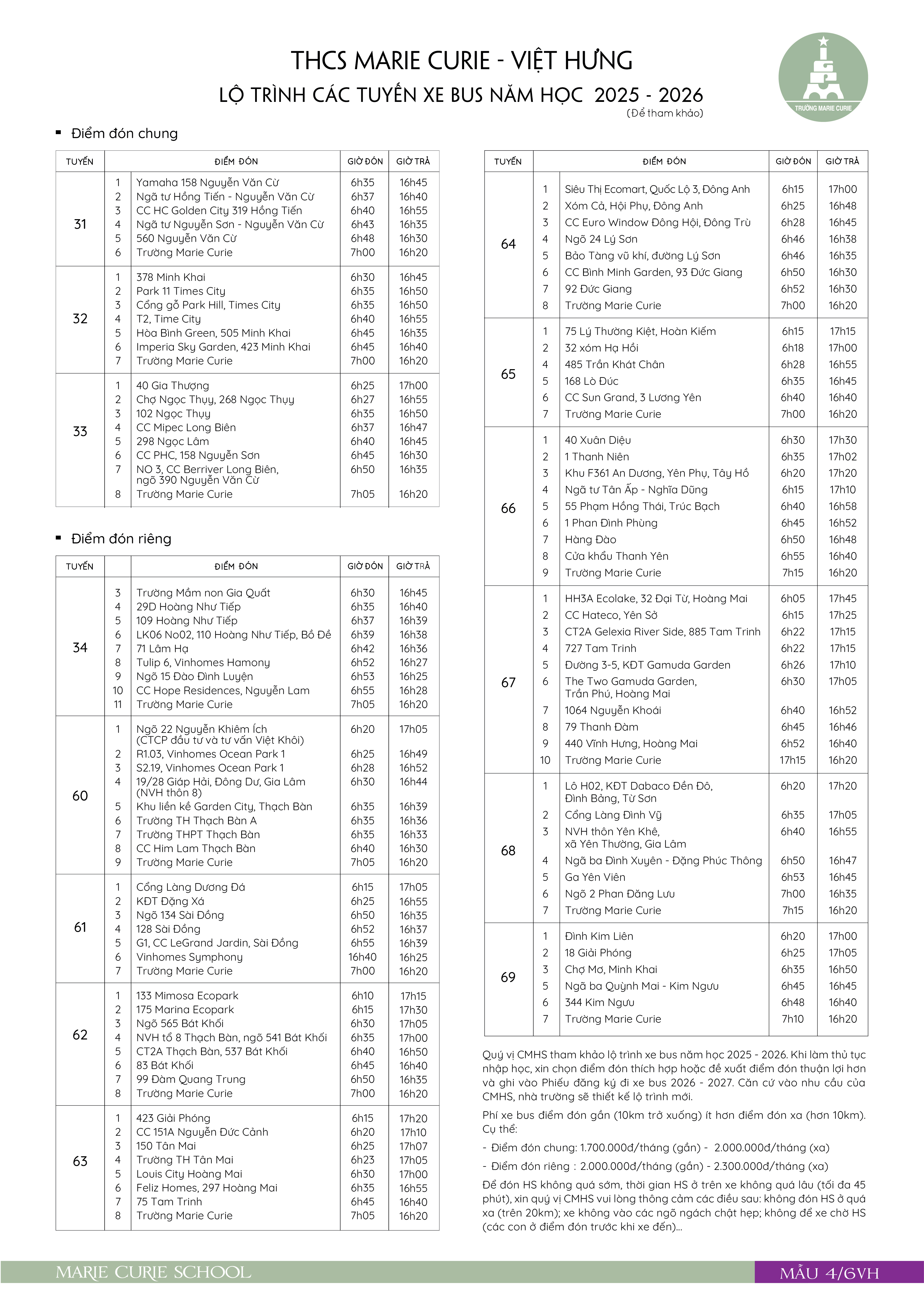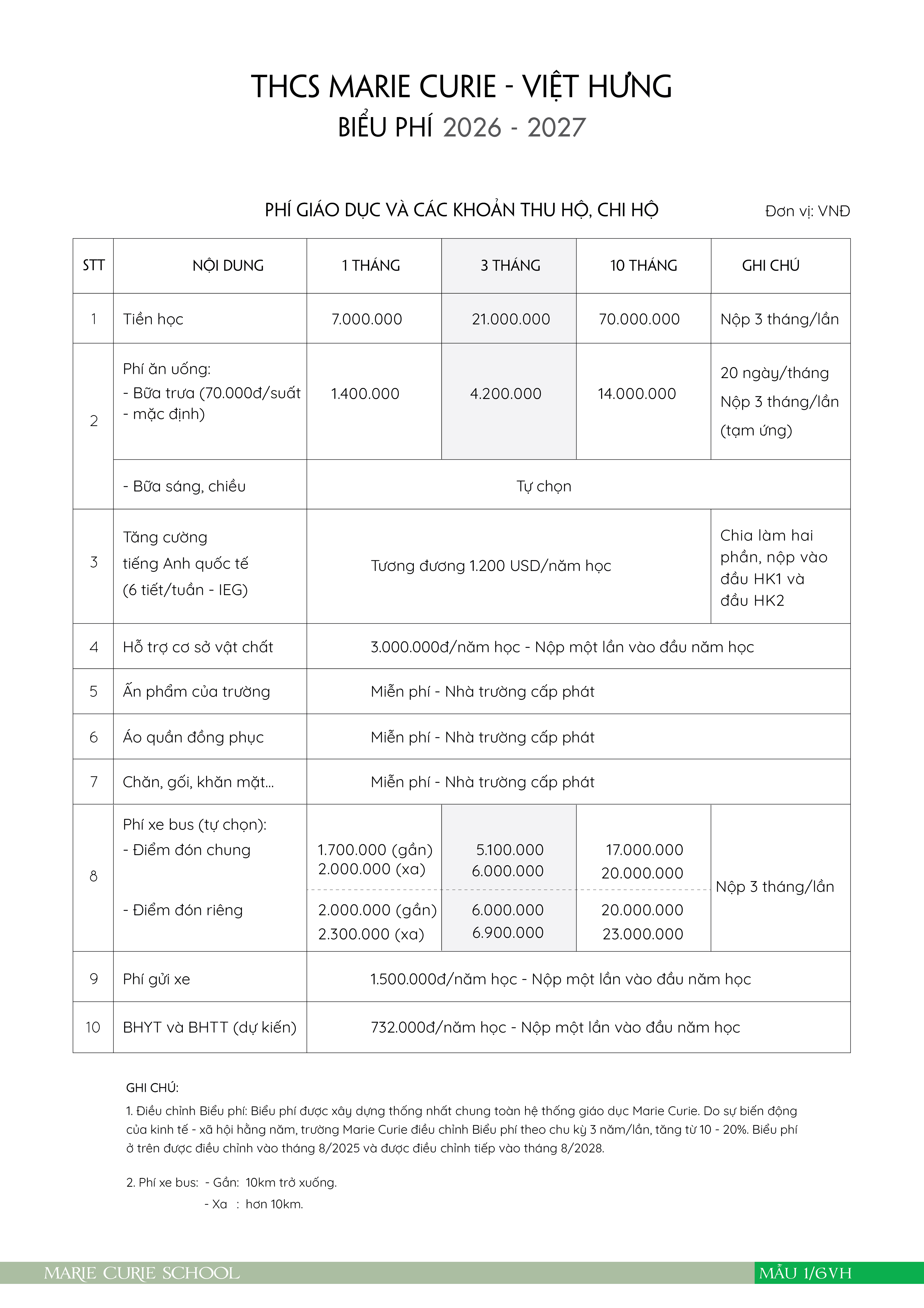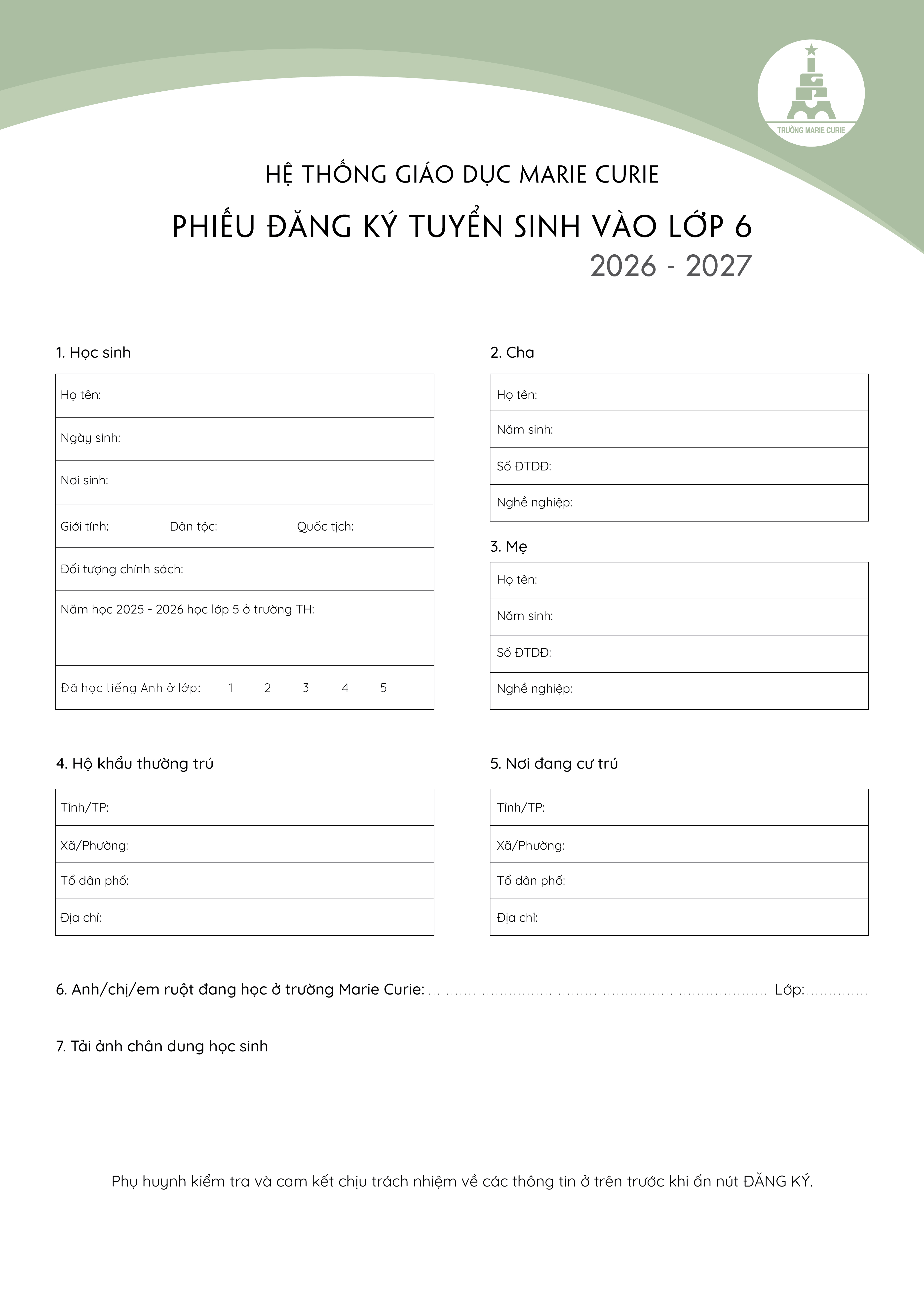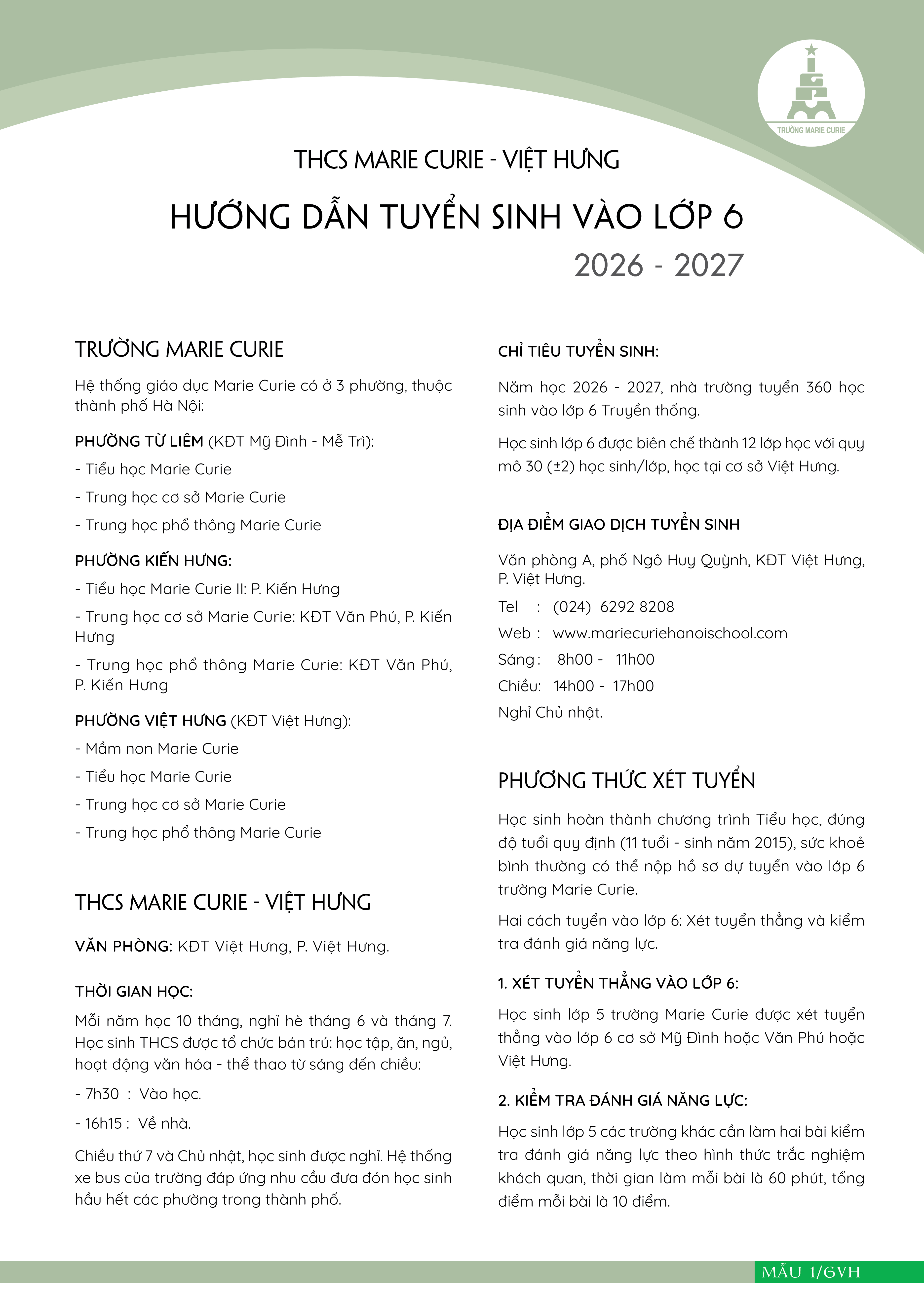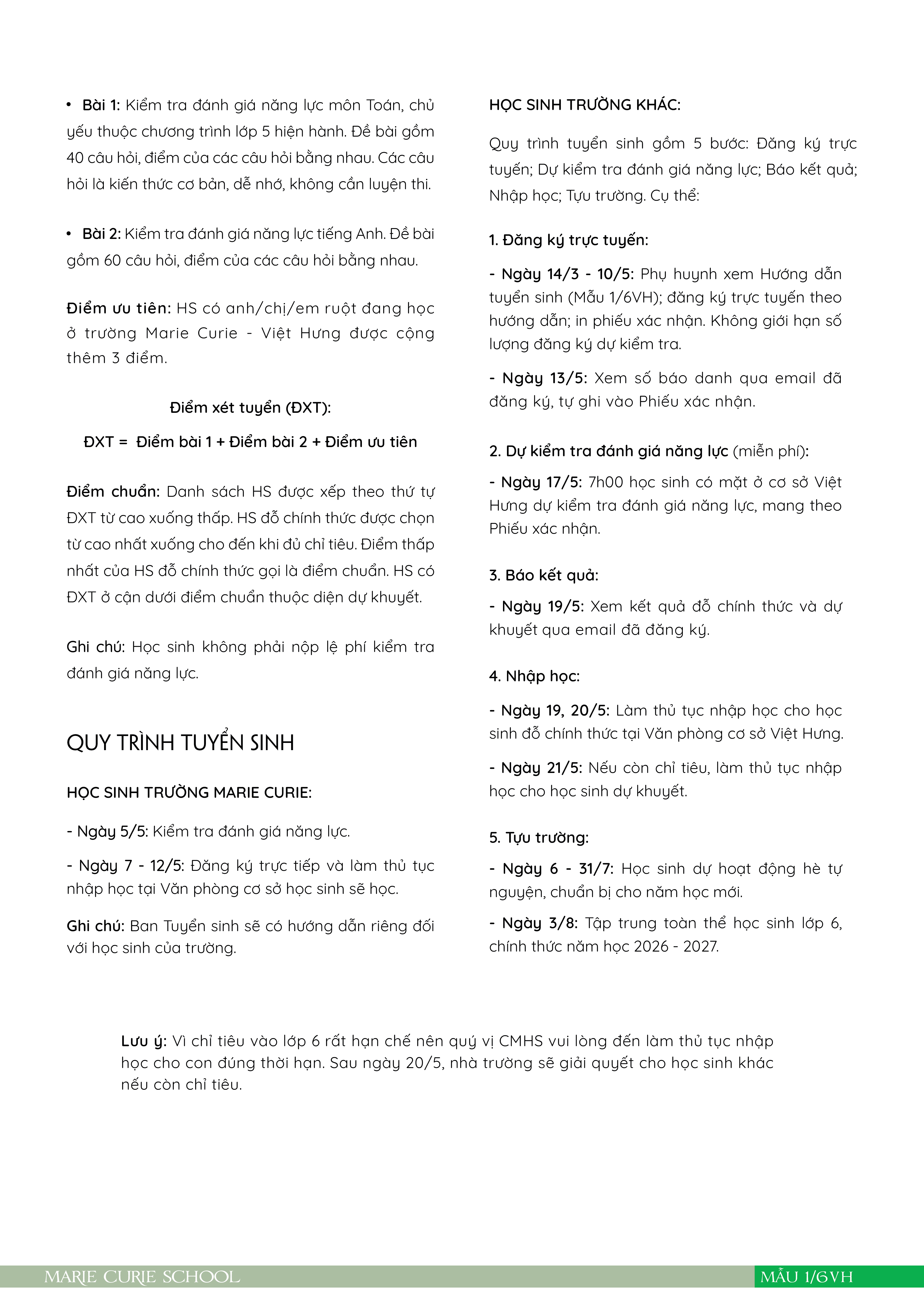 Thông báo số 2 về hướng dẫn tuyển sinh vào lớp Mẫu giáo, lớp 1 và lớp 6 năm học 2026 - 2027 của hệ thống giáo dục Marie Curie, Hà Nội.